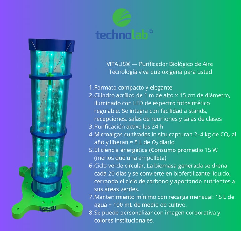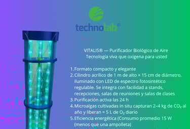 Los purificadores de aire con microalgas de Technolab están disponibles en 2 tamaños: 10 y 20 litros, diseñados para adaptarse a diversos espacios de oficinas corporativas, salas de clases, eventos y ferias